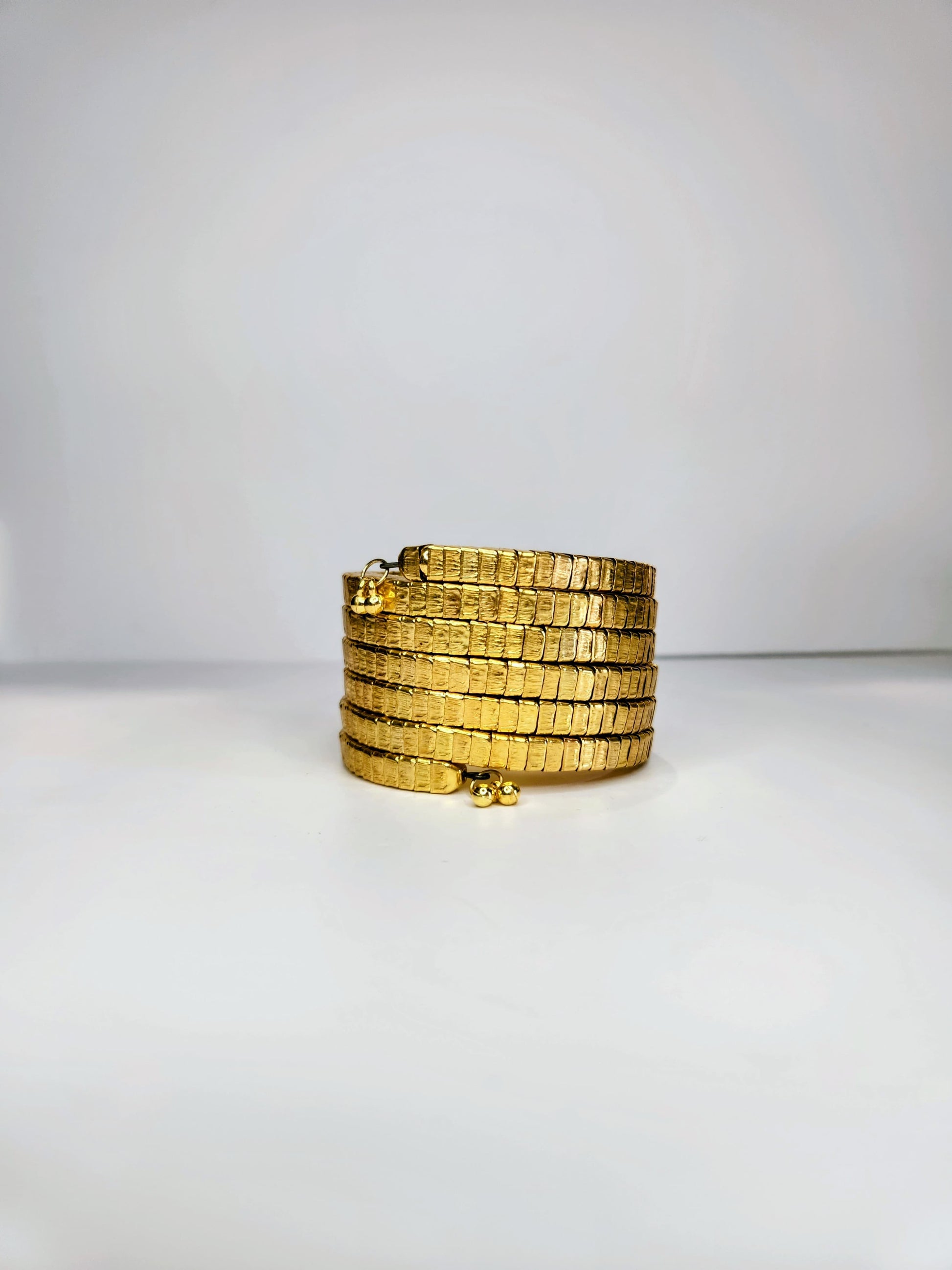 Finished in luminous gold plating, the design captures light from every angle, making it the perfect statement accessory for both everyday elegance and special occasions. The open spiral structure allows for a flexible, one-size-fits-all fit, ensuring comfort without compromising style. Simply slip it on and let it contour naturally to your wrist.