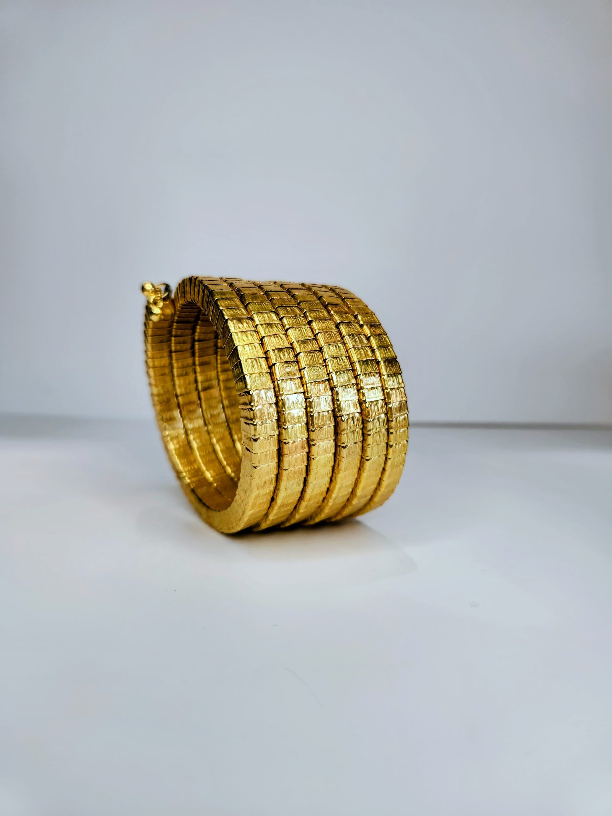 These gold-plated spiral bangles are a modern take on timeless Indian jewelry — sculptural, radiant, and designed to move with you. Crafted with a fluid spiral silhouette, each bangle wraps gracefully around the wrist, creating dimension, shine, and undeniable presence.
