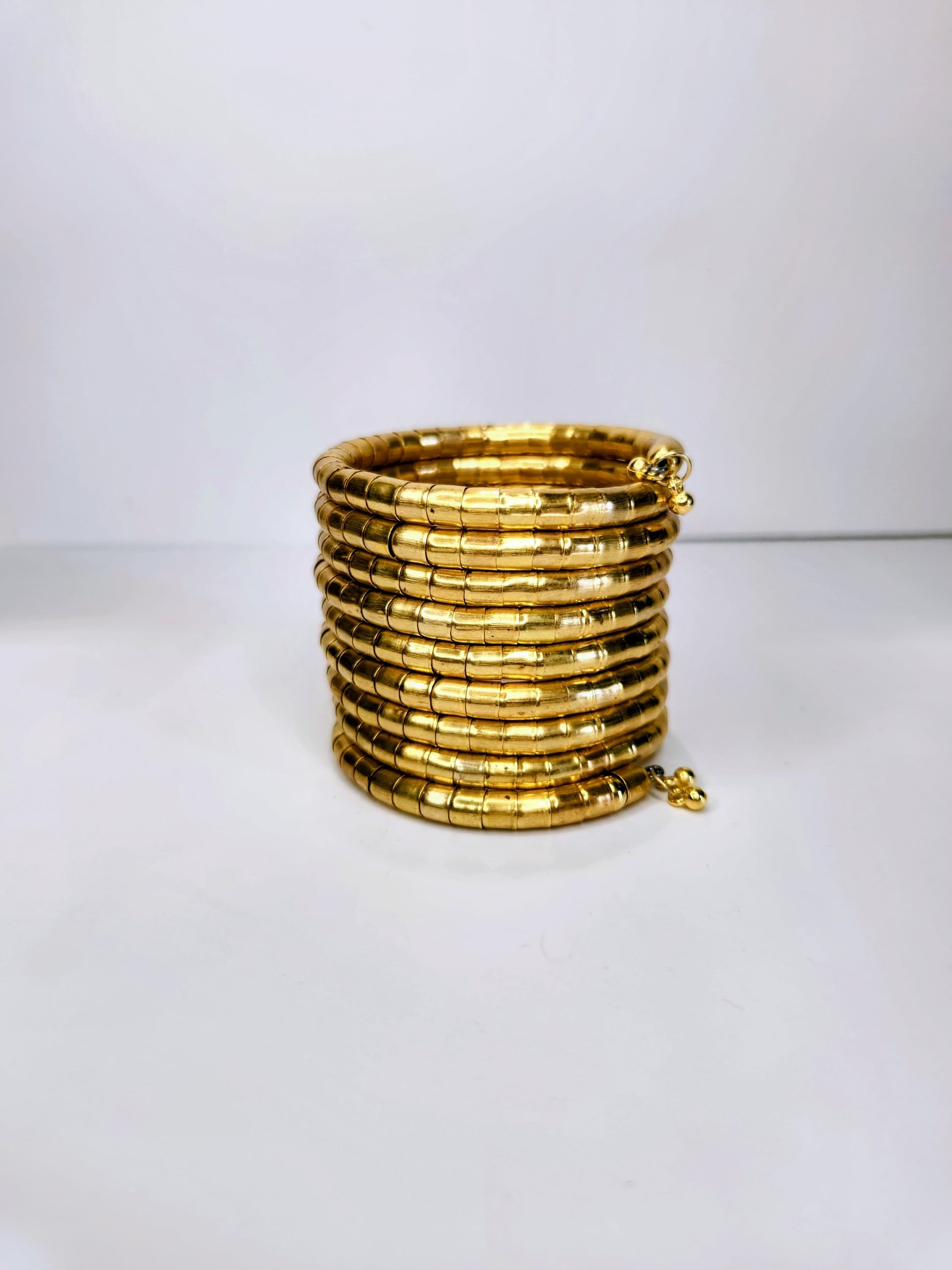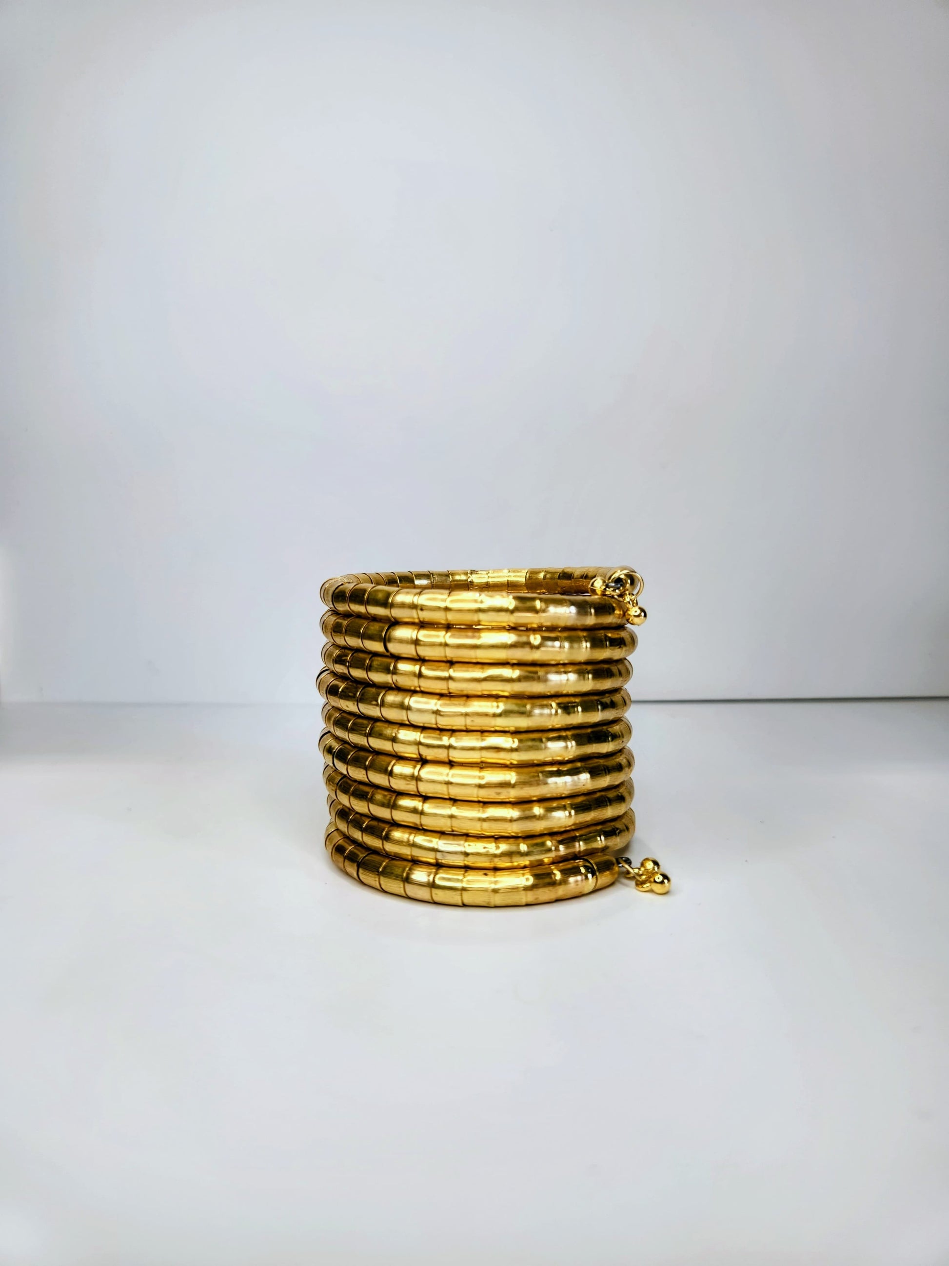 These gold-plated spiral bangles are a modern take on timeless Indian jewelry — sculptural, radiant, and designed to move with you. Crafted with a fluid spiral silhouette, each bangle wraps gracefully around the wrist, creating dimension, shine, and undeniable presence.